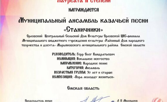 с 29 июля 2024г. по 19 августа 2024 года в г.Липецк прошёл (дистанционный) II всероссийский конкурс творчества и искусств «Великие дарования». Организатор конкурса Творческий проект «Софи». Конкурс проводился при поддержке: — государственного театра танца «Казаки России». Муниципальный ансамбль казачьей песни «Станичники» Орловского ЦСДК –рук. Герр О.К. приняли участие в номинации […]