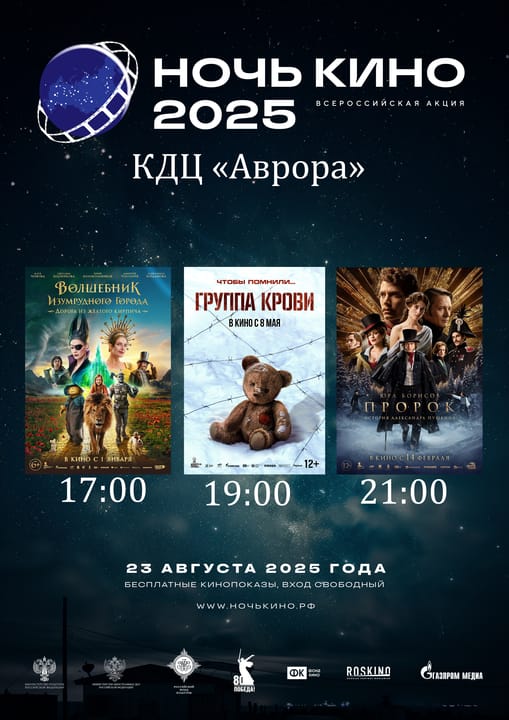 23 августа 2025 года в КДЦ «Аврора» состоится юбилейная 10-я Всероссийская акция «Ночь кино» – мероприятие, ставшее за эти годы уже доброй семейной традицией для миллионов зрителей. Акция приурочена ко Дню российского кино, который отмечается 27 августа.