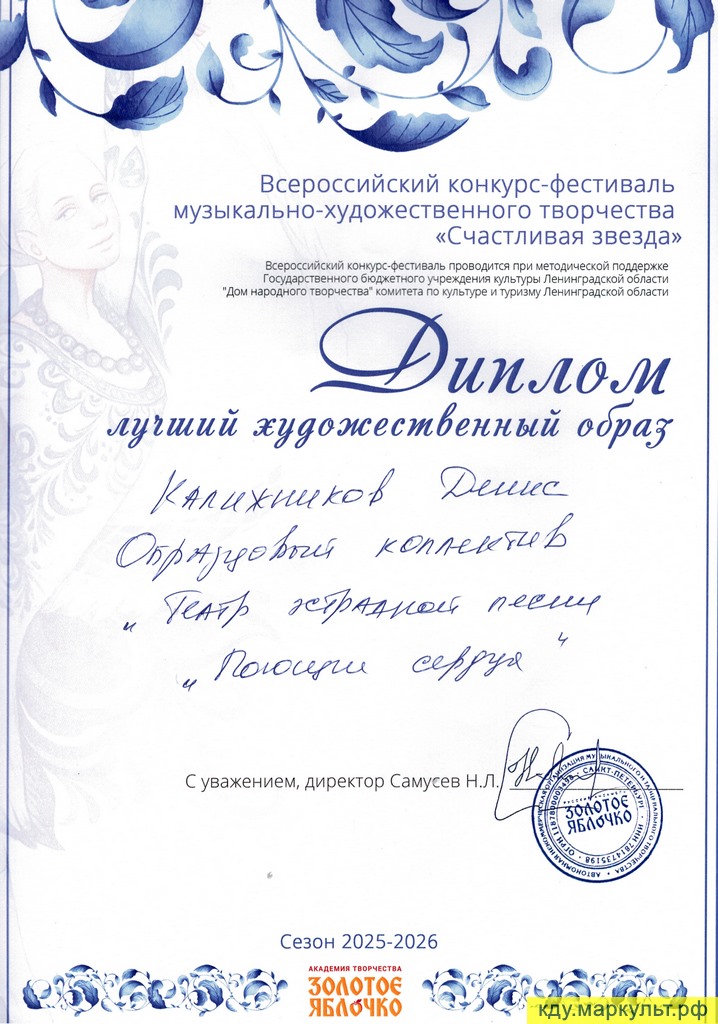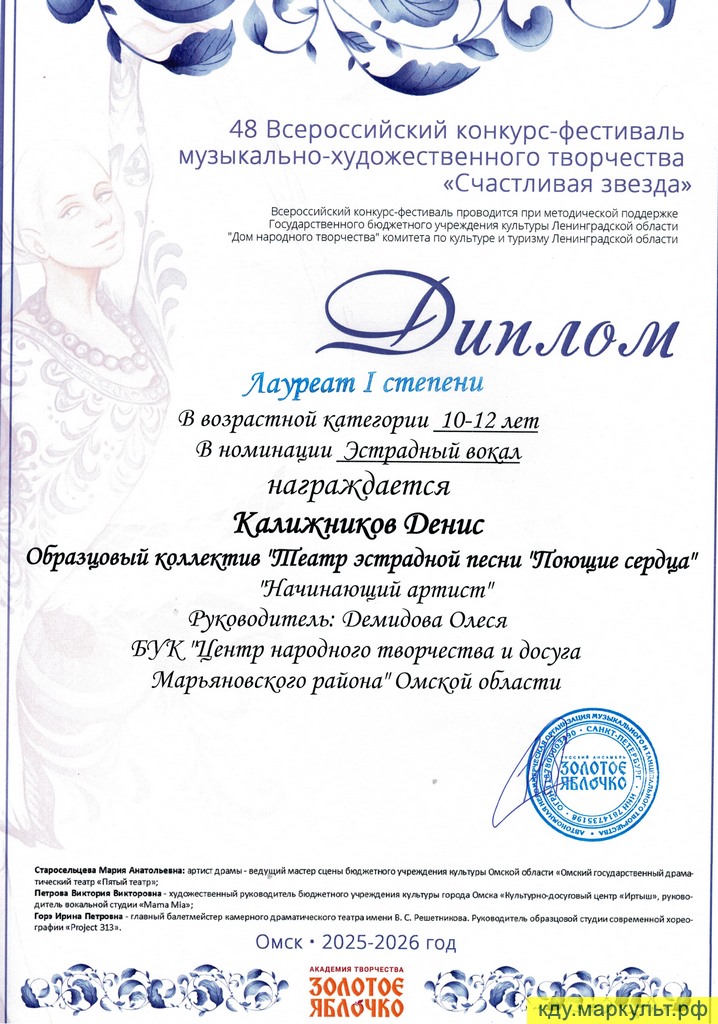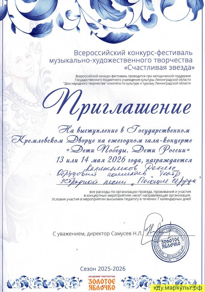 Диплом Лауреата I степени получил Калижников Денис, солист образцового вокального коллектива «Театр эстрадной песни «Поющие сердца» (рук-ль: Демидова О.В.) и получил приглашение в Государственный Кремлёвский Дворец на ежегодный гала – концерт «Дети Победы. Дети России».