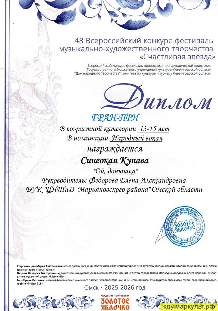 Гран-при конкурсаудостоена Синеокая Купава, солистка Марьяновского районного Дома культуры (рук-ль: Фёдорова Е.А.) и получила приглашение на участие в Ежегодной международной Премии в области культуры и творчества «Золотое Яблочко» в Большом концертном зале «Октябрьский» в г. Санкт-Петербург.