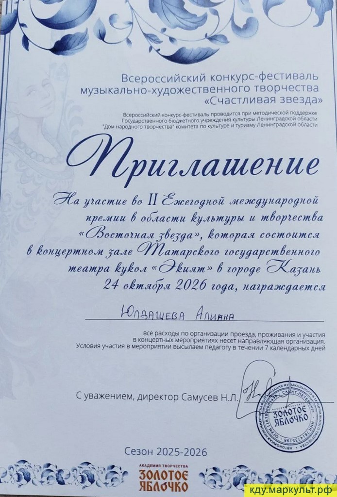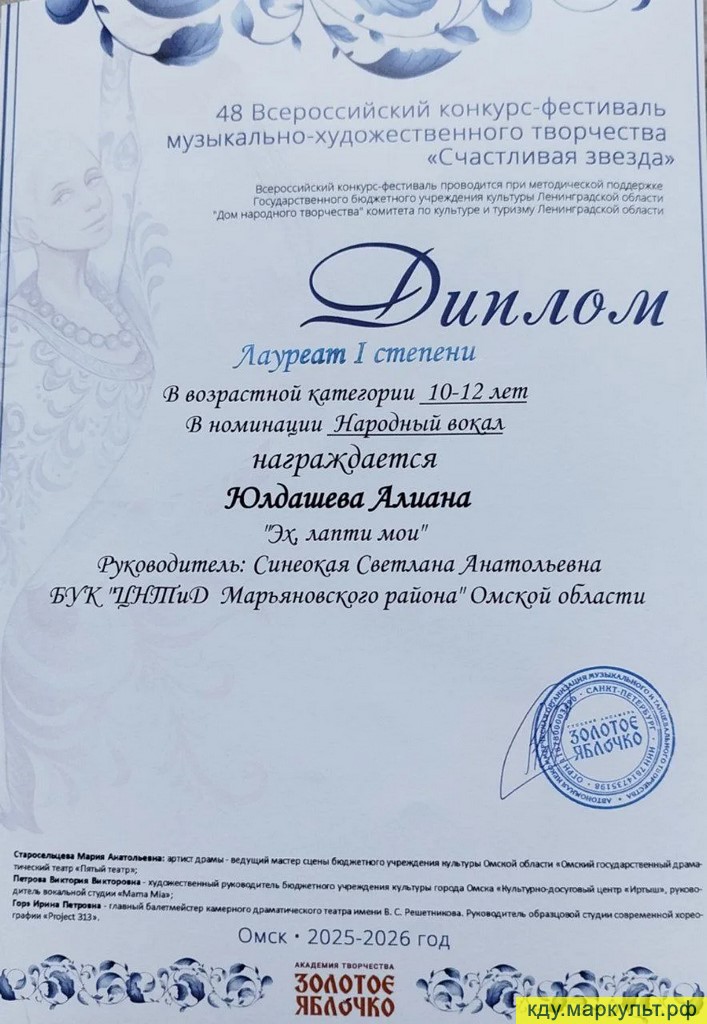 Диплом Лауреата I степени — Юлдашева Алиана, солистка образцового детского вокального ансамбля «Авсень» (рук-ль: Синеокая С.А.), и получила приглашение на Ежегодную международную Премию в области культуры и творчества «Восточная звезда» в г. Казань.