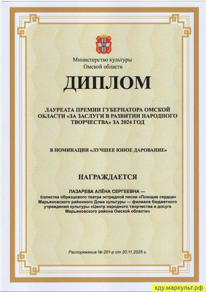 Алёна Лазарева, солистка образцового вокального коллектива «Театр эстрадной песни «Поющие сердца» Марьяновского районного Дома культуры была удостоена высокой чести – Диплома Лауреата Премии Губернатора Омской области «За заслуги в развитии народного творчества». Её талант и мастерство в вокальном искусстве были отмечены в номинации «Лучшее юное дарование».