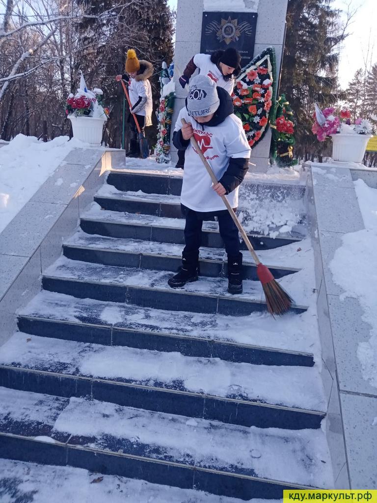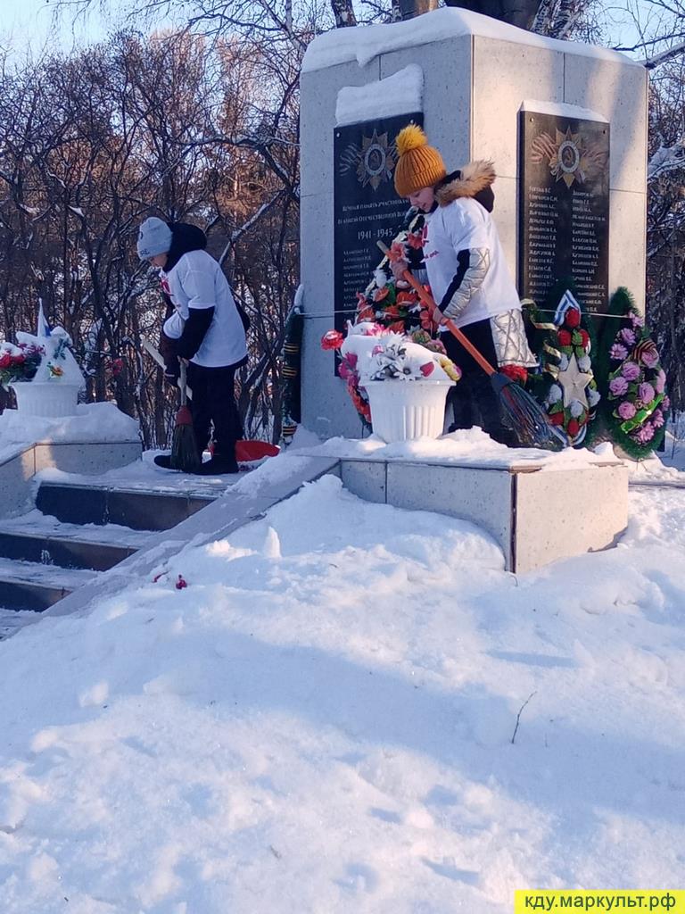 Вооружившись необходимым инвентарем ребята очистили памятник после обильного январского снегопада. Все трудились с большим душевным подъемом. Работа оказалась нелегкой, снега намело много, он был твердым и тяжелым. Приятно было видеть результат своего труда.