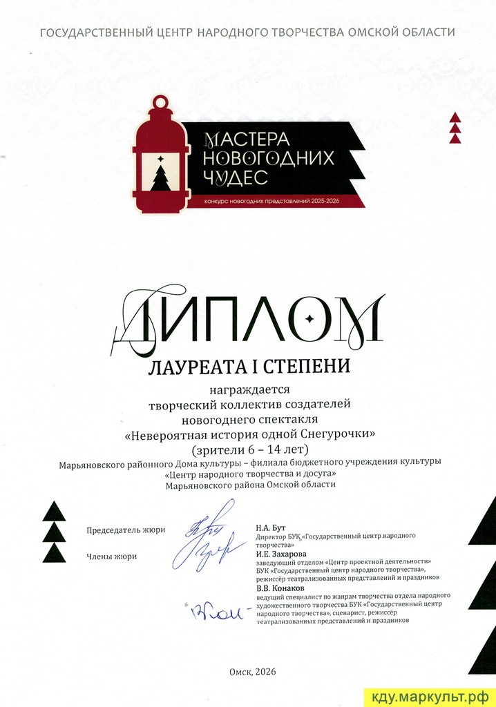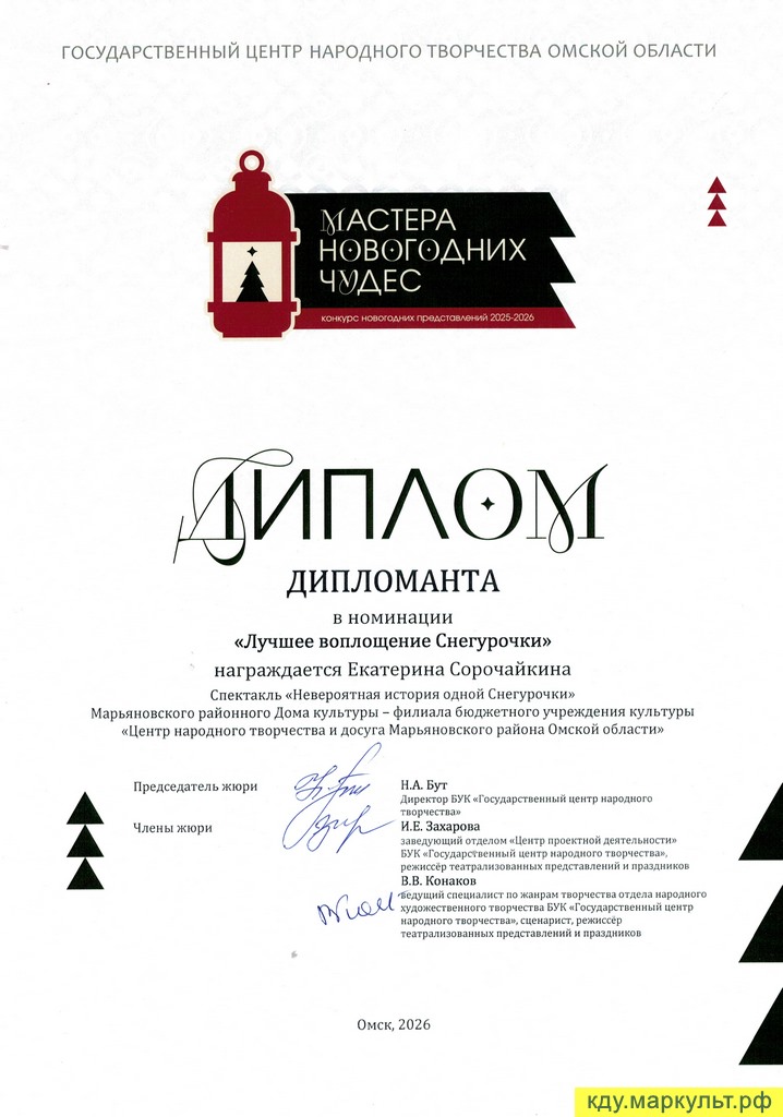 Среди лауреатов конкурса – коллектив Марьяновского районного Дома культуры под руководством режиссёра Марины Битехтиной за спектакль «Невероятная история одной Снегурочки» в номинации «Новогодний спектакль (Сценическое действие). Их талант и мастерство были высоко оценены, и они по праву заняли первое место, став Лауреатами 1 степени! А также специальным Дипломом «Лучшее перевоплощение Снегурочки» была удостоена Екатерина Сорочайкина – актрисы детской театральной студии «Проект М» (рук-ль: Битехтина М.В.).