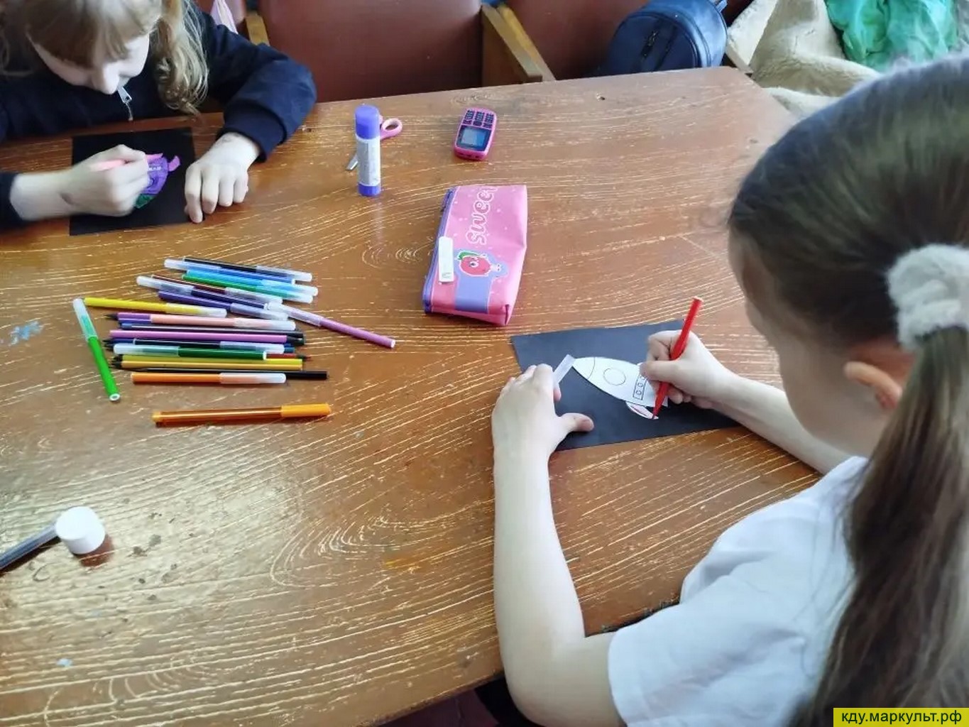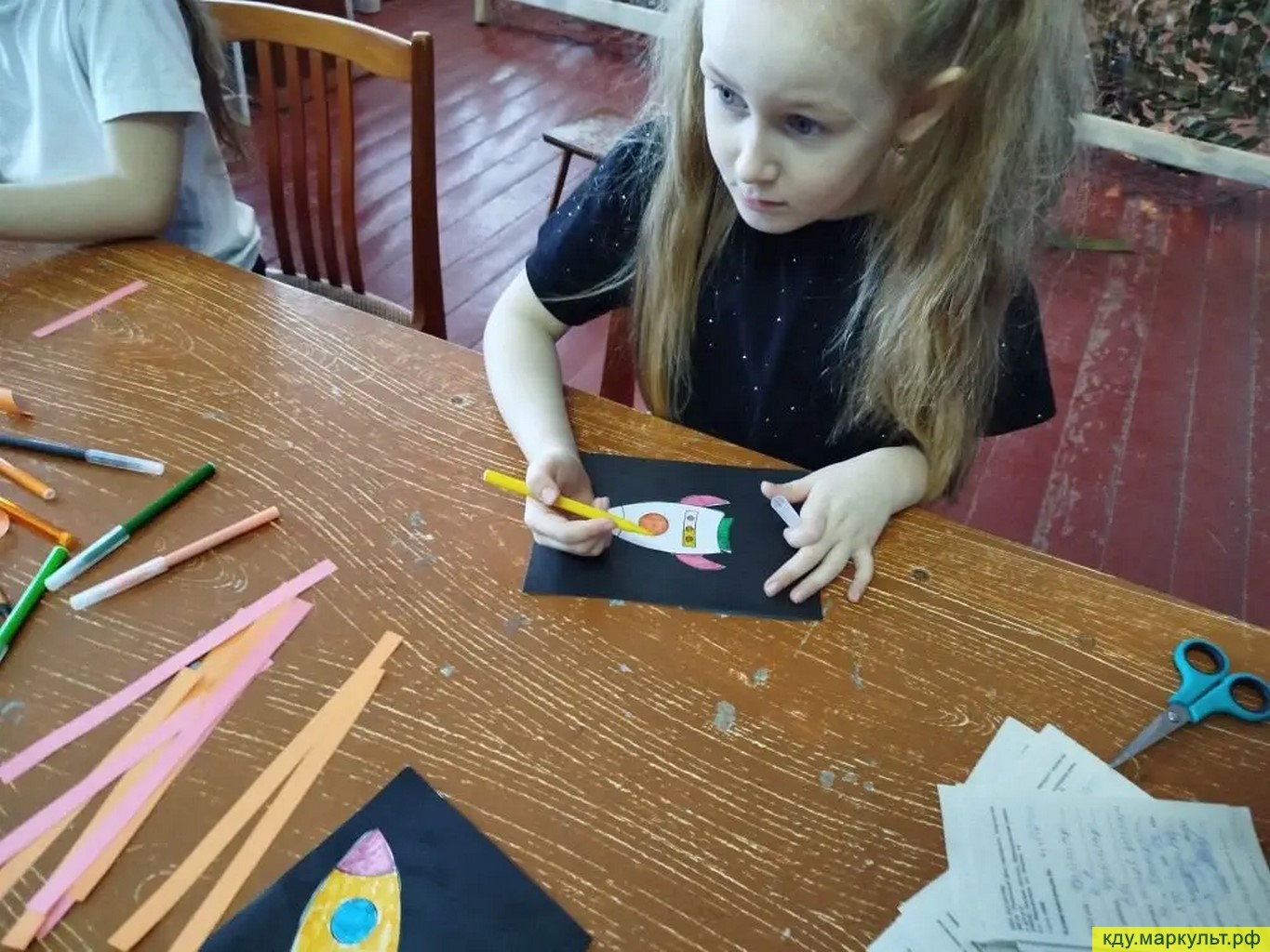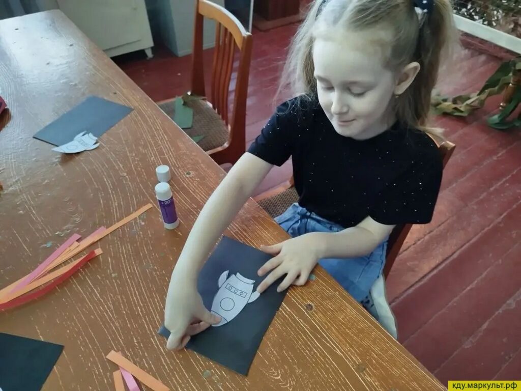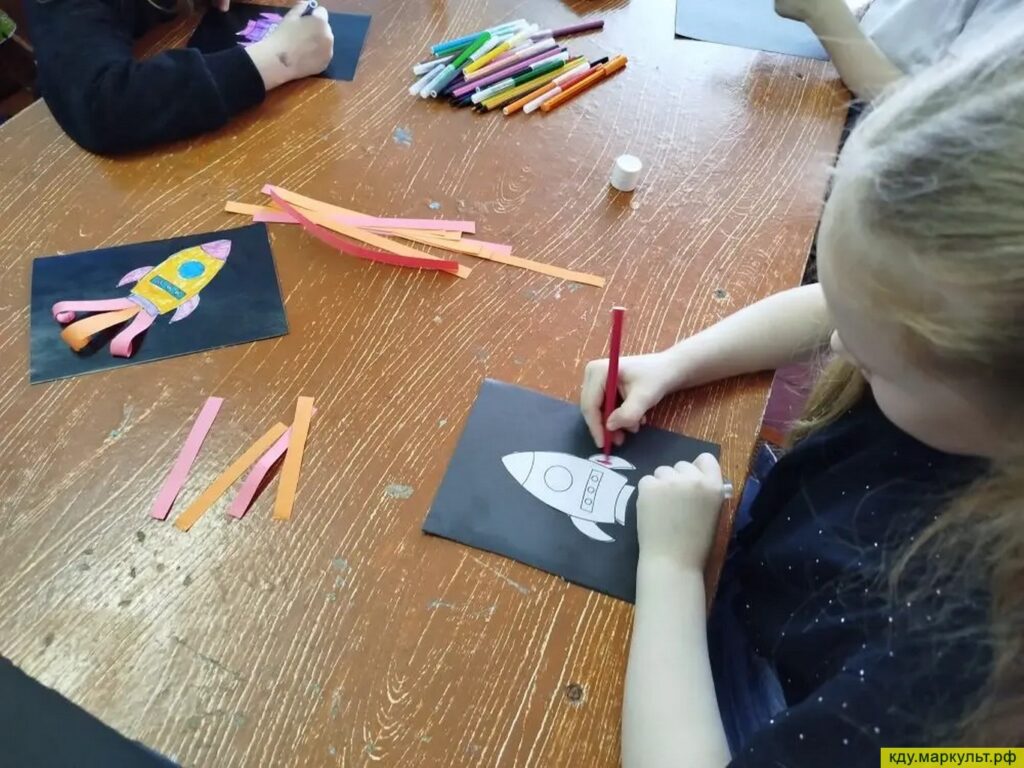 Проявляя умения и навыки ребята с увлечением вырезали по шаблонам элементы для поделки, аккуратно клеили и дорисовывали фломастерами детали ракеты.